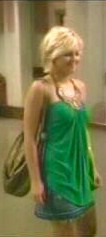Later (right) she keeps the mini, but changes into a tighter trashy top with an odd scarf falling free in the front. Perhaps on someone else they wouldn’t look so trashy, but paired with her overly bleached hair and her trampy actions she wins the trailer park award this week.