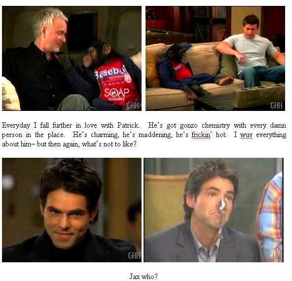 If you really think about it, it isn’t even all that far-fetched – at least not the way the GH writers do their thang. Back in the early 80’s when Robert and Luke were running around that island - who’s to say that Mr. Scorpio didn’t stumble upon a very young, naive, unloved and unwanted Natasha? We already know that Alexis’ mother had been personally eliminated by Helena. It’s also been stated that Helena felt that Natasha’s presence had been thrust upon her as Mikkos’ ill-begotten offspring and to say she was despised is probably putting it mildly. If things got out of hand, even once… why couldn’t Sam be the product? Robert wouldn’t have known about the pregnancy and Alexis would have been desperate to keep her secret so that Helena wouldn’t have any further reason to hate her or eliminate the child. Sam would, by rights be a Cassadine heir. Another one of Mikkos’ grandchildren, just like Nikolas. Alexis had a midwife on the island help deliver Sam and then gave her money to take care of the child. Then the midwife did the easy thing and sold her to another family (The McCalls) for more green. Sam is brought up by a mother who doesn’t care about her, probably because she’s not her biochild to begin with. Dad teaches Sam the grifter schtick and also the salvage biz. Throw in a Dead Man’s hand and a doubleheader with Jax and Sonny and we’ve got ourselves a new hoochie in town. Cassahoochie – now wouldn’t that be faboo? Hey -it could happen. Random Randomness Loved the scenes with Luke and Bubbles the Chimp. Jason and Bubbles were also really sweet. The always say never work with kids or animals… I guess these two must’ve missed the memo. Again, please.