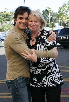 SET WITH RICK HEARST I was at an event for Rick Hearst in 2006 and bid with another person at the silent auction for a tour of the GH set. We were naively ambushed in the last minute of the auction and lost, so I inquired as to whether Rick would do another one. All of the money goes to his favorite charity, which is HARK (Healing Arts Reaching Kids of Children’s Hospital, LA), and that was a great incentive for me. I got word shortly thereafter that he agreed to this additional tour, which took a while to enact due to everyone’s schedules. Last Monday, in LA for the first time, I drove to the studio in Hollywood and met also, for the first time, my co-bidder and new friend Lynn. We walked over to a building that coincidentally enough had a sign in front that said General Hospital and Emergency Room on the side. We were guided once inside past doors with familiar names on them (dressing rooms) to the Green Room. Rick was in hair and makeup and would be with us shortly. Two day players were in the room, and the actor who plays Randy (Marianna’s buddy) was walking around. On the closed circuit TV in the room, we were able to watch “Lulu, Scott and Logan” taping in the hospital, and “Michael” with his new lady friend. I looked around and saw Kin Shriner majestically stroll down the corridor, as well as Josh Duhon, who plays Logan. Our host Rick then appeared, in all his exuberance, and greeted us with a hug. Just then Stephen Macht walked in and they hugged each other, which seemed bizarre since Ric and Trevor Lansing are sworn enemies. But this was real life, and it was nice to see the great relationship they have. Steven chatted with us and let us take a few photos. He was quite charming and amiable.