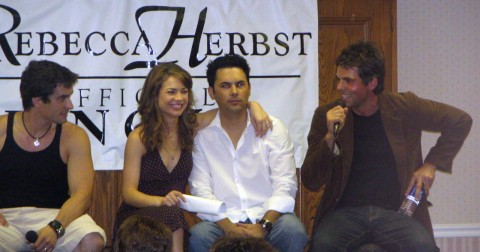 Currently, Sonya is a day player but of course she’d like a more permanent gig. Laughing I remarked that she already had family on the show and interaction with several main characters all she needed was a love interest or a wedding dress scene and she’d have a major foot in the door. She asked if she looked OK and I assured her that she looked fine and then we were making our way to the front of NLG’s event. Nancy was signing autographs so I reluctantly left Sonya in the capable hands of the lady running Nancy’s event. I watched for a couple minutes as she charmed and entertained a new set of fans. I made my way back to Rebecca’s event knowing I’d hit a highlight for this trip. A fan asked why Liz couldn’t see Lucky’s addiction and Rebecca responded that Liz loves Lucky so much that she doesn’t want to see the signs of Lucky’s addiction. Rebecca sells brownies at her events and yes, she actually bakes them herself. Rebecca, Michael Saucedo and Jason Thompson were answering questions when Rick Hearst strolled in. I’d like to clarify something that I’ve read several times. Michael Saucedo gets called Mr. Rebecca Herbst often but he doesn’t push his way into Rebecca’s limelight. It’s clear when you watch them that he supports her and is there for her, not to garner attention for himself. When he added to the conversation, which wasn’t often, it was to tease his wife or make a general comment.